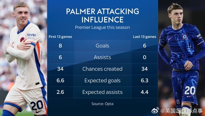天空體育:帕爾默過去13場英超創(chuàng)造34次機會,但沒有收獲一個助攻 天空體育:帕爾默在過去13場英超比賽中創(chuàng)造了34次機會,預(yù)期助攻為4.4,但實際沒有收獲一個助攻???? 2025/02/25