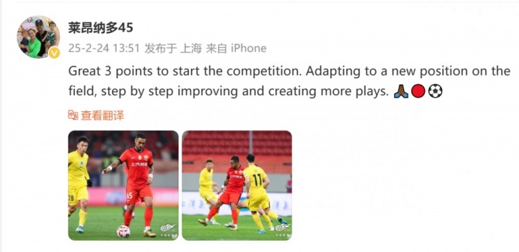 首發(fā)全場&贏球!海港外援萊昂納多:拿下三分 正適應(yīng)場上新位置 2月24日訊 本輪中超,海港3-1擊敗深圳新鵬城,萊昂納多為海港首發(fā)出戰(zhàn)全場&出任前腰。萊昂納多賽后更新社媒:拿下三分開啟新賽季,我正在適應(yīng)新的場上位置,得逐步提升表現(xiàn),創(chuàng)造更多出場機會。 2025/02/24