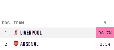 穩(wěn)了??利物浦最新英超奪冠概率高達96.7%,阿森納3.3% 曼城歸0 02月24日訊 本輪英超利物浦客場2-0擊敗曼城,爭冠對手阿森納主場輸球,這讓爭冠天平徹底傾斜。目前利物浦先賽已經(jīng)領(lǐng)先阿森納11分。數(shù)據(jù)機構(gòu)Opta的超級計算機演算顯示,利物浦的奪冠概率已經(jīng)來到了前所 2025/02/24