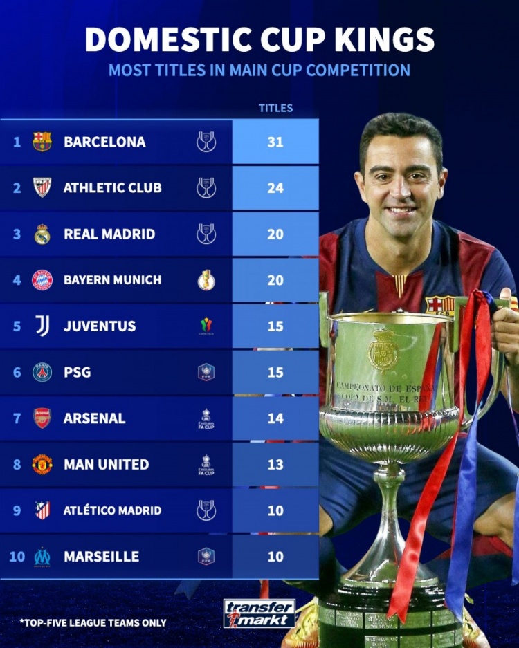 德轉(zhuǎn)列五大聯(lián)賽國內(nèi)杯賽奪冠榜:巴薩31次第1,畢巴24次第2 2月28日訊 五大聯(lián)賽的國內(nèi)杯賽淘汰賽本周進(jìn)行中,德轉(zhuǎn)列出了五大聯(lián)賽國內(nèi)杯賽奪冠次數(shù)榜單,巴薩31次排名第一,畢巴24次排名第二。五大聯(lián)賽國內(nèi)杯賽奪冠榜:1,巴薩:國王杯31冠2,畢巴:國王杯24冠3 2025/02/28
