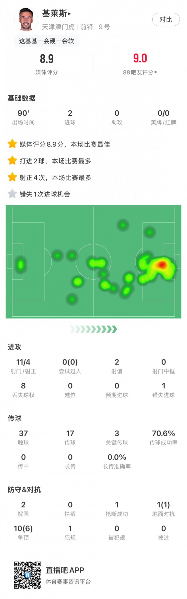 基萊斯全場數(shù)據(jù):11次射門4次射正 最后時刻連進2球拯救津門虎 2月23日訊 今天下午進行的新賽季中超首輪比賽,主場作戰(zhàn)的津門虎,在兩球落后的不利形勢下,依靠基萊斯在比賽最后時刻的兩個進球,2-2艱難戰(zhàn)平梅州客家。梅開二度的基萊斯也成為了本場比賽表現(xiàn)最為搶眼的球員 2025/02/23