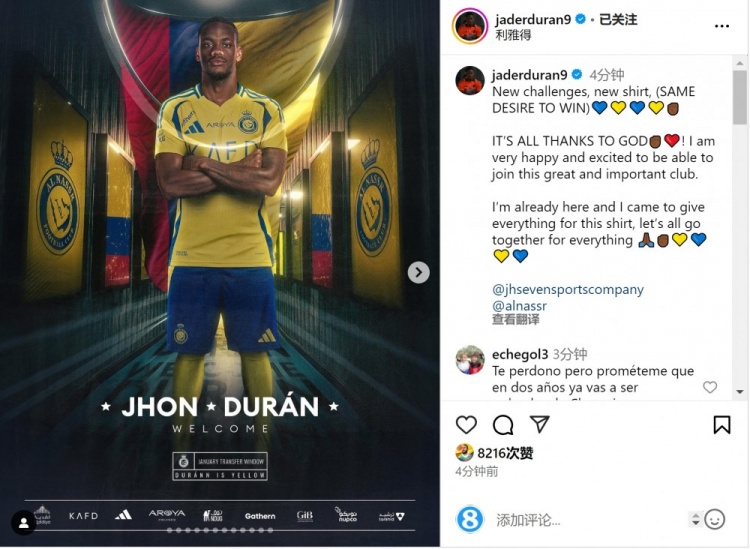 杜蘭社媒:很高興加盟利雅得勝利,將為這身球衣付出一切 2月2日訊 維拉前鋒杜蘭加盟利雅得勝利,據(jù)悉轉(zhuǎn)會(huì)費(fèi)7700萬歐加浮動(dòng),杜蘭在社交媒體上曬出海報(bào),談到了加盟的感想。杜蘭寫道:“新的挑戰(zhàn),新的球衣(不變的是對勝利的渴望)?!薄斑@一切都要感謝上帝!能夠加 2025/02/02