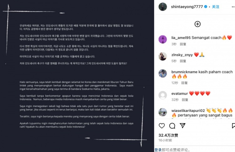 申臺(tái)龍發(fā)聲明警告印尼媒體:如果再發(fā)布不實(shí)傳聞,就不會(huì)輕易翻篇 2月2日訊 今日前印尼主帥申臺(tái)龍更新社媒,用韓語(yǔ)和印度尼西亞語(yǔ)發(fā)布聲明,對(duì)部分印尼媒體進(jìn)行警告。近期有印尼媒體報(bào)道,稱申臺(tái)龍?jiān)趫?zhí)教印尼國(guó)家隊(duì)期間使用“水軍”,在申臺(tái)龍受到批評(píng)時(shí)有一個(gè)指定賬戶就會(huì)發(fā)消息 2025/02/02