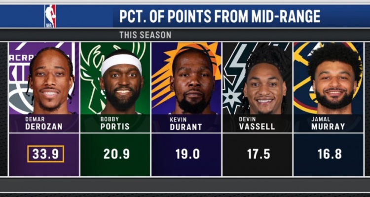 經(jīng)典永不過(guò)時(shí)!本賽季中距離得分占比德羅贊33.9%第一&杜蘭特第三 2025/03/23