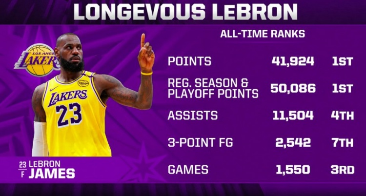 長(zhǎng)青!詹姆斯今日賽前41924分歷史第一 總助攻第4&總?cè)謹(jǐn)?shù)第7 老詹41924分歷史第一;常規(guī)賽+季后賽50086分第一;總助攻11504第4;總?cè)置?542個(gè)歷史第7;出戰(zhàn)1550場(chǎng)歷史第3 2025/03/23