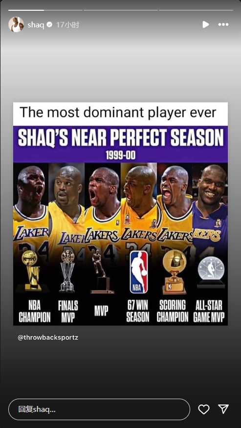 歷史最具統(tǒng)治力單賽季表現(xiàn)?99-00賽季的奧尼爾 一人囊括5項大獎 02月28日訊 今日,奧尼爾更新社媒曬出了歷史最具統(tǒng)治力的單賽季表現(xiàn)。1999-2000賽季的奧尼爾自己,他一人囊括5項大獎(總冠軍、總決賽MVP、常規(guī)賽MVP、得分王、全明星MVP)+單賽季67勝。 2025/02/28