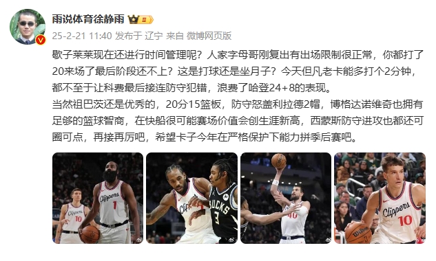 徐靜雨寫道:“歇子萊萊現(xiàn)在還進(jìn)行時間管理呢?人家字母哥剛復(fù)出有出場限制很正常,你都打了20來場了最后階段還不上?這是打球還是坐月子?今天但凡老卡能多打個2分鐘,都不至于讓科菲最后接連防守犯錯,浪費(fèi)了哈登24+8的表現(xiàn)。