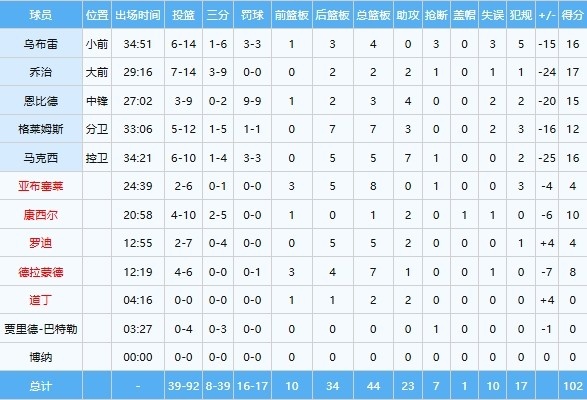 本場比賽喬治拿到球隊最高17分,馬克西和烏布雷拿到16分,恩比德拿到15分,格萊姆斯12分,康西爾10分。
