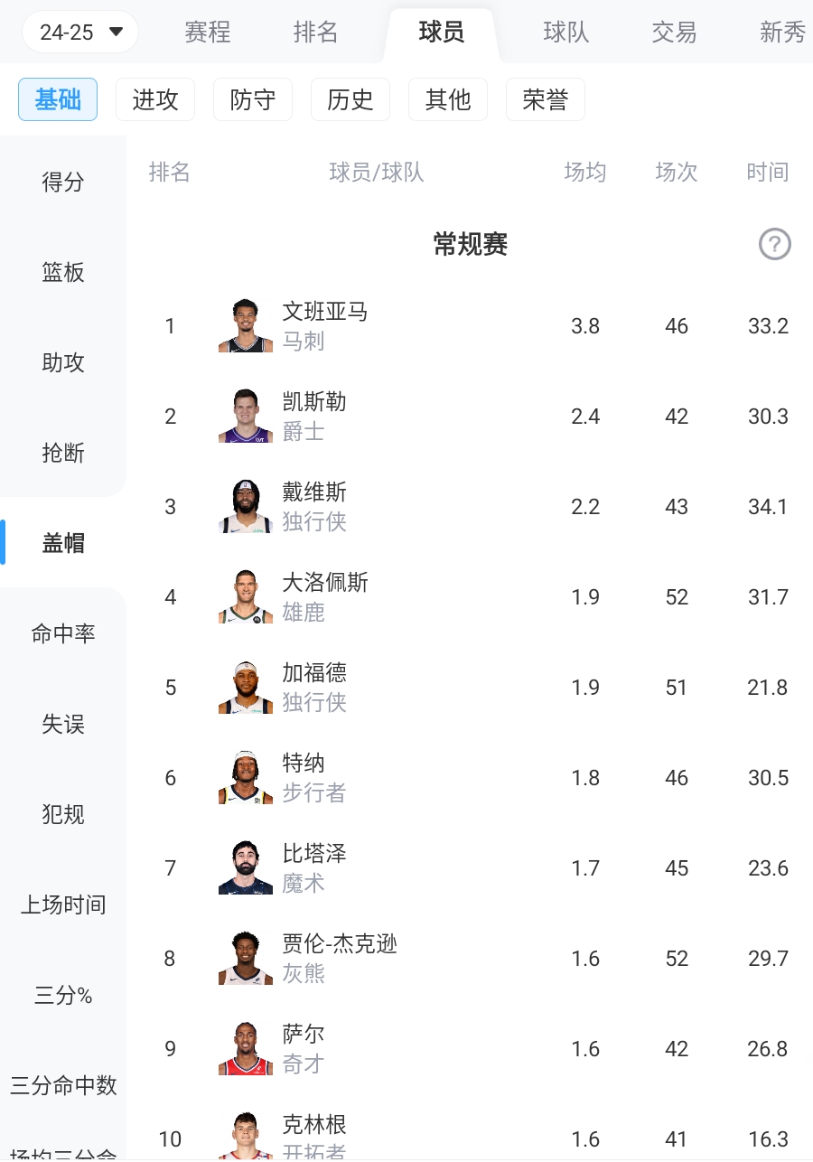 本賽季,文班亞馬代表馬刺出戰(zhàn)46場常規(guī)賽,場均貢獻24.3分11籃板3.7助攻1.1搶斷3.8蓋帽。在蓋帽一項數(shù)據(jù)當(dāng)中,文班斷檔領(lǐng)先第二名的爵士球員凱斯勒。