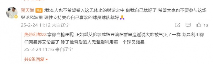 之后,賀天舉還在這條動(dòng)態(tài)的評(píng)論區(qū)寫道:“我本人也不希望卷入這無(wú)休止的輿論之中 做我自己就好了 希望大家也不要參與這場(chǎng)輿論風(fēng)波里 理性支持關(guān)心自己喜歡的球員球隊(duì)就好????”