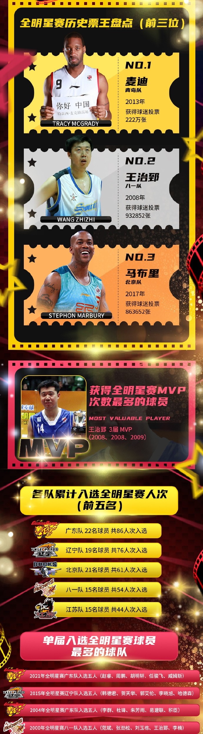 其中,全明星賽個人單場得分紀(jì)錄由比斯利(63分)保持,朱芳雨15次入選全明星冠絕聯(lián)盟,麥迪為全明星賽歷史票王。