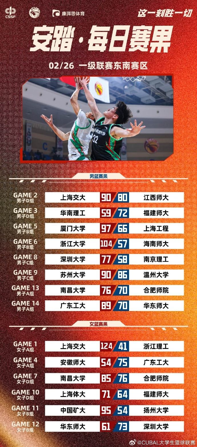 男籃方面,上海交大10分之差險勝江西師大,福建師大初生牛犢不怕虎10名大一新生拿下首勝,廈門大學、浙江大學、深圳大學均大勝對手。蘇州大學南昌大學以微弱優(yōu)勢拿下首勝。而在最受關(guān)注的揭幕戰(zhàn)上,廣東工業(yè)大學在曾煜成的精彩發(fā)揮下戰(zhàn)勝華東師大,取得小組賽首勝!