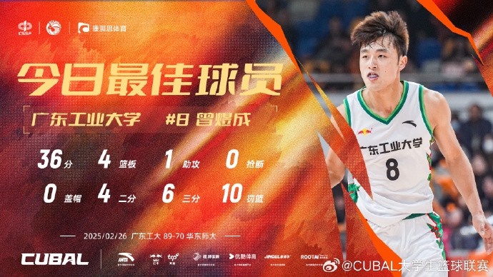 今日的MVP給到廣東工業(yè)大學(xué)8號(hào)曾煜成,在東南賽區(qū)的揭幕戰(zhàn)中對(duì)陣華東師大拿下36分4籃板1助攻的成績(jī),成功率隊(duì)拿下首勝!