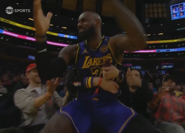 詹姆斯快攻上籃飛出場(chǎng)外摔到場(chǎng)外觀眾席 裁判未響哨&老詹十分不滿