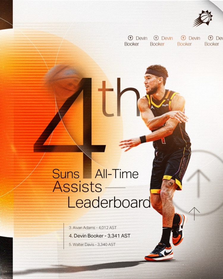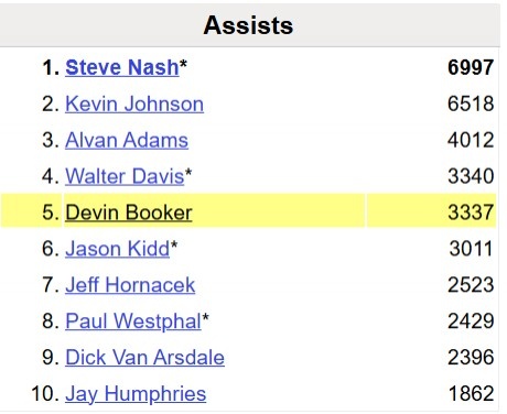這樣一來,布克太陽生涯助攻數(shù)達(dá)到3341,超越沃爾特-戴維斯升至隊(duì)史第4。