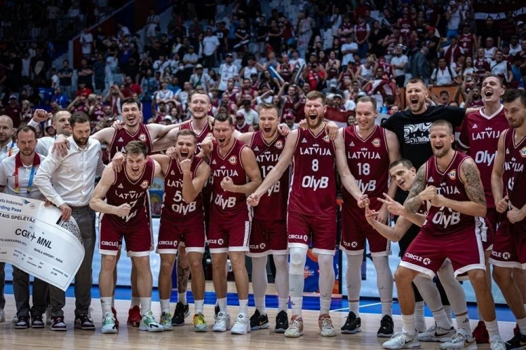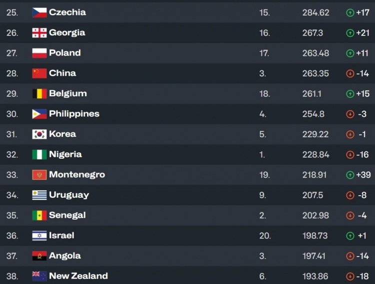 接著,你還要看看對手的世界排名,據(jù)此加上第三個項,公式為1.5*(世界排名平均數(shù)-對手排名),這蘊含著擊敗越強對手獲益越多、輸給越弱對手懲罰越重的理念。2023年狀態(tài)強勁的拉脫維亞,曾短期內(nèi)連續(xù)掀翻西班牙、法國、希臘在內(nèi)的多支排名高于自己的強隊,世界杯正賽上更是大勝巴西立陶宛喜提第五,藉此排名從29名暴漲到前八。