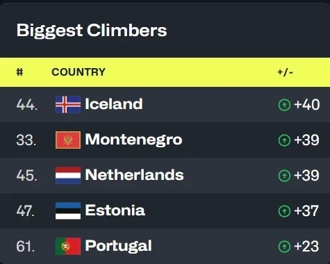 2023年9月,克羅地亞再掉五個名次,排名正式落到中國身后,他們在那個被新納入統(tǒng)計的窗口期合計輸給瑞典荷蘭烏克蘭55分,令人無語。