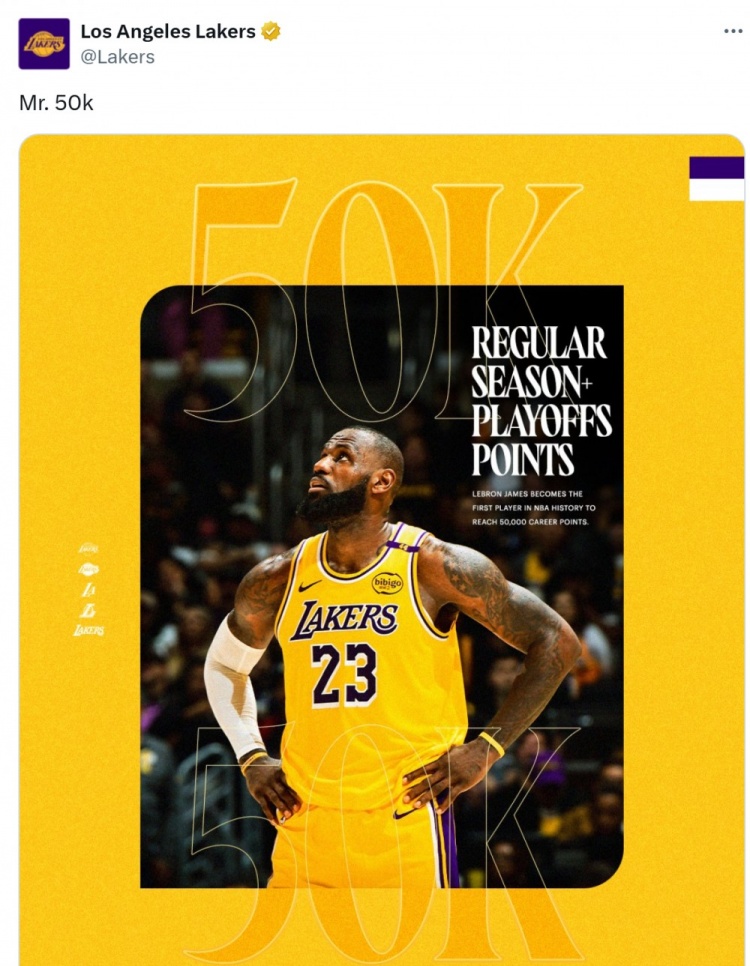 3月5日訊 今日湖人vs鵜鶘,詹姆斯拿下3分后生涯常規(guī)賽+季后賽總得分突破了50000分。湖人官方曬出海報(bào)寫(xiě)道:“50000分先生?!?/p> 標(biāo)簽: 籃球 NBA 湖人 詹姆斯