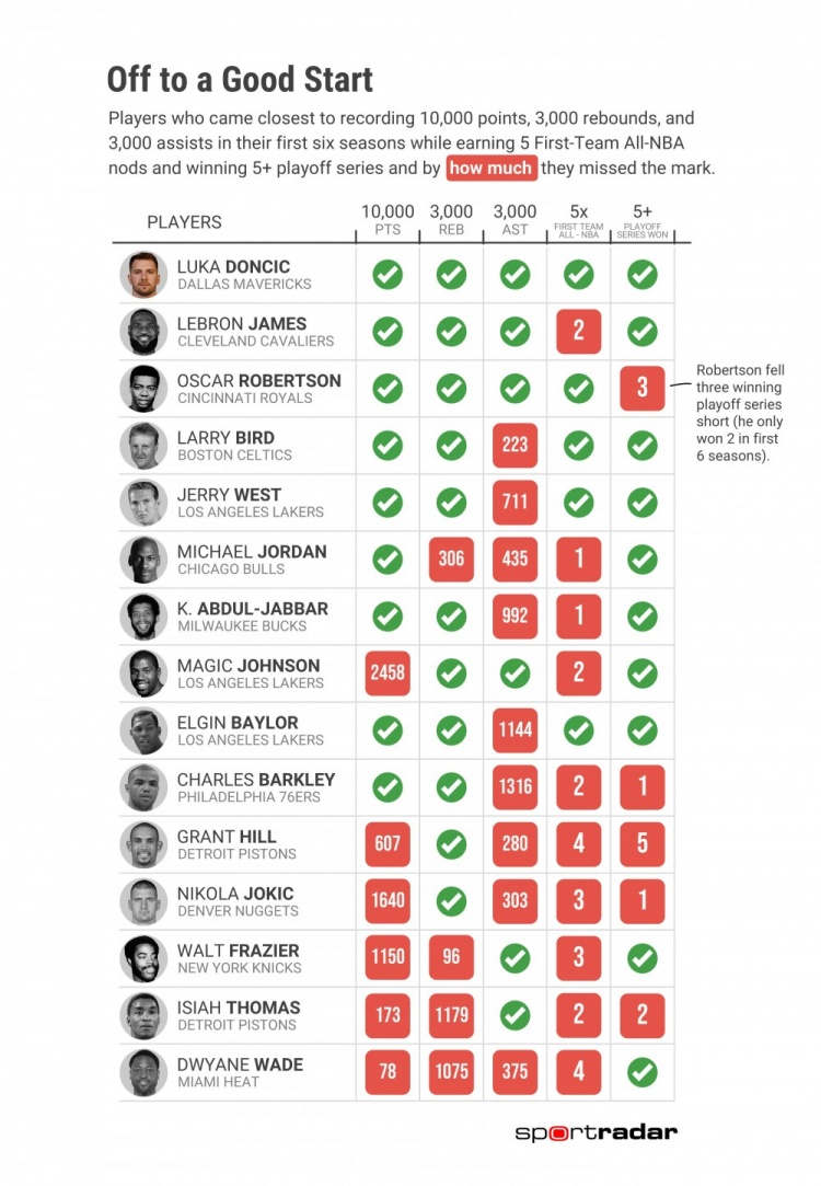 在生涯前6個賽季中,東契奇至少得到10000分、3000籃板、3000助攻,且5次入選年度最佳陣容一陣+贏下至少5個季后賽系列賽,是歷史唯一。