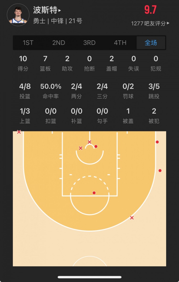 勇士52號(hào)秀 昆滕-波斯特 登場21.1分鐘