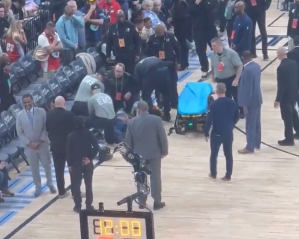 據(jù)ESPN記者M(jìn)ichael C. Wright報(bào)道,因場(chǎng)邊發(fā)生緊急醫(yī)療情況本場(chǎng)比賽被迫暫停,急救人員目前正在為一位坐在場(chǎng)邊的觀眾進(jìn)行心肺復(fù)蘇。