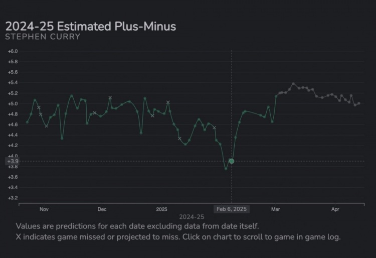 非常有趣的是,斯蒂芬的預(yù)計正負(fù)值在勇士隊交易得到吉米之后就完全像火箭一樣飛升了。