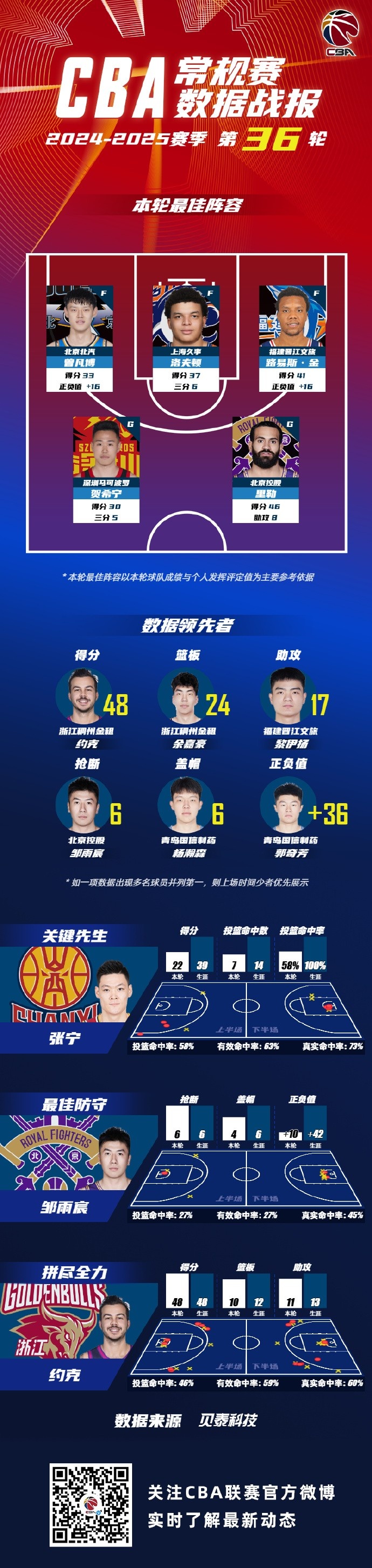 數(shù)據(jù)領(lǐng)先者方面:浙江稠州籃球俱樂部球員約克以單場48分的數(shù)據(jù)領(lǐng)銜得分榜;