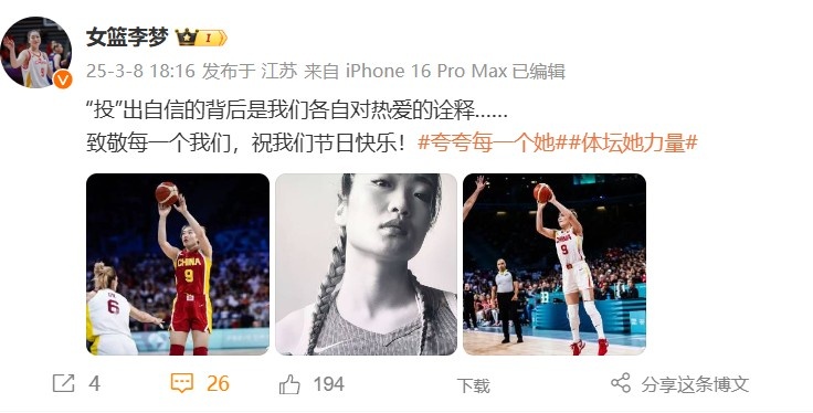 李夢(mèng)配文:”‘投’出自信的背后是我們各自對(duì)熱愛(ài)的詮釋。致敬每一個(gè)我們,祝我們節(jié)日快樂(lè)!“