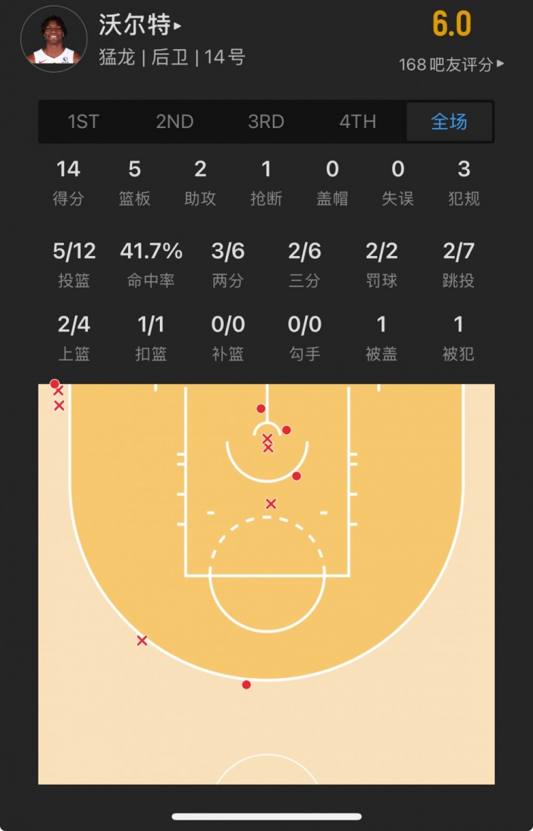 猛龍19號(hào)秀 賈科比-沃爾特 登場(chǎng)18.3分鐘