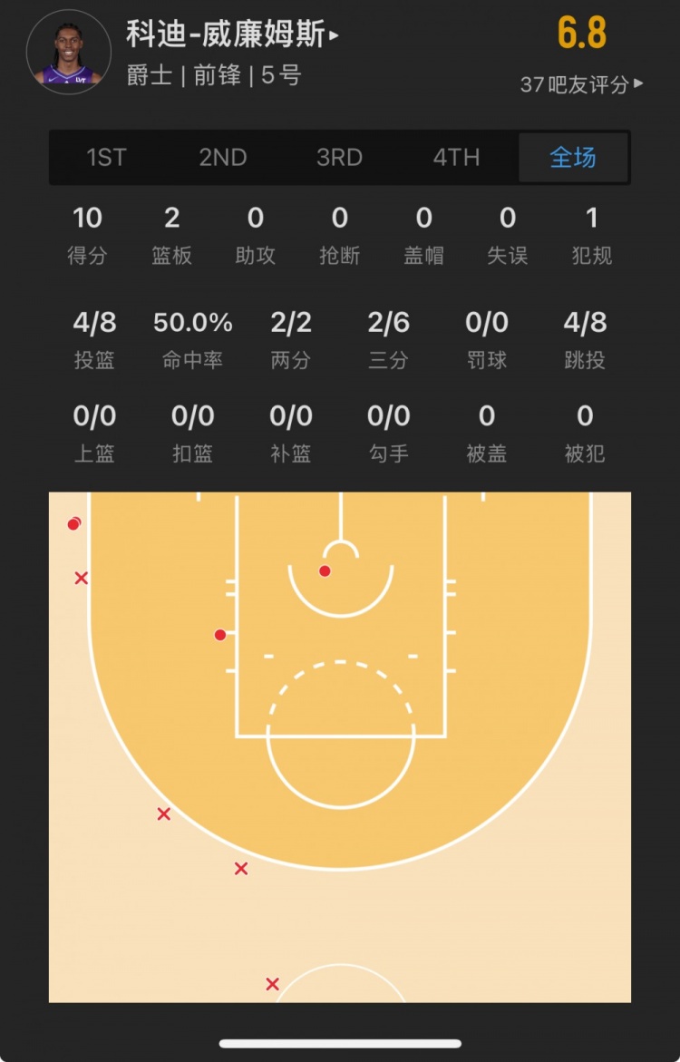 爵士10號(hào)秀 科迪-威廉姆斯 登場(chǎng)21.6分鐘