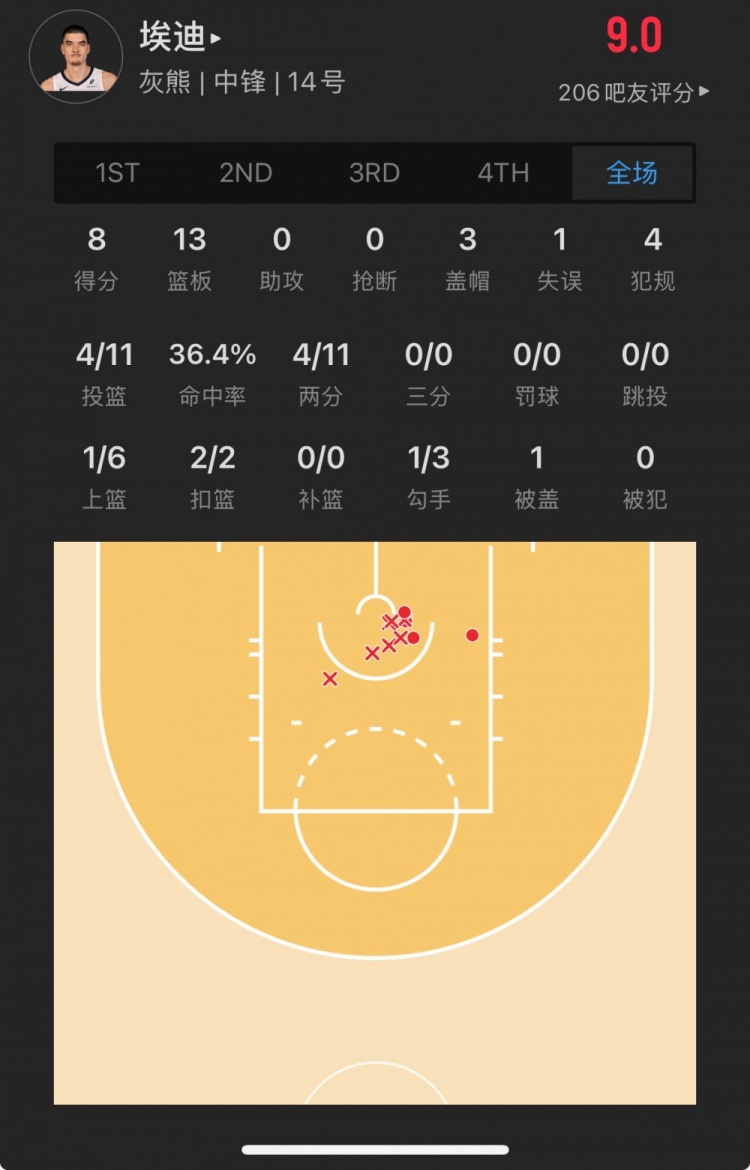 灰熊9號(hào)秀 扎克-埃迪 登場(chǎng)21.8分鐘