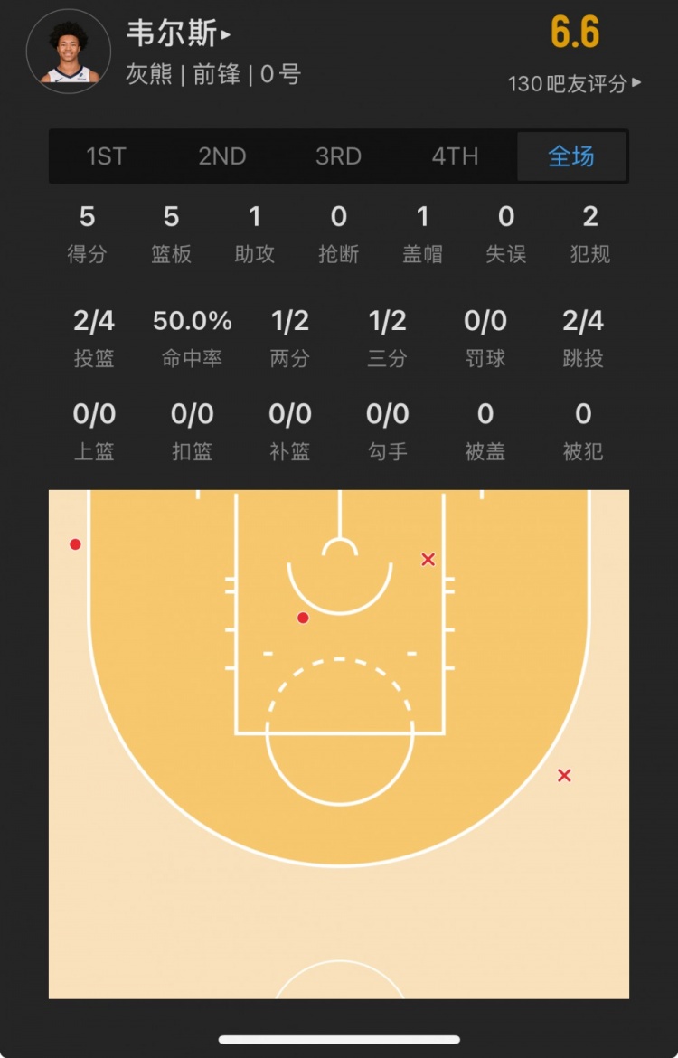 灰熊39號(hào)秀 杰倫-韋爾斯 登場(chǎng)21.0分鐘