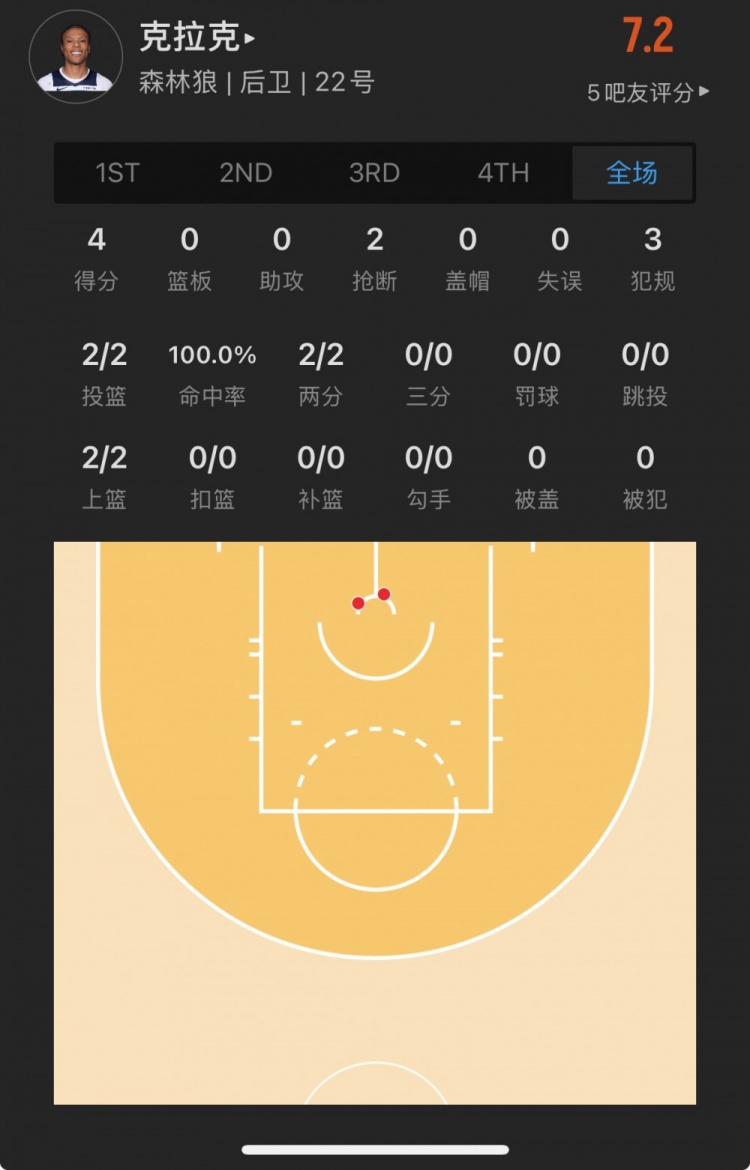 森林狼23年53號(hào)秀 杰倫-克拉克 登場(chǎng)11.6分鐘