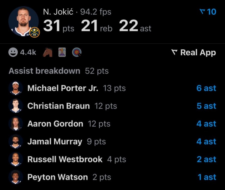 創(chuàng)造52分!約基奇22助攻分布:波特6次 布勞恩5 穆雷&戈登4 威少2