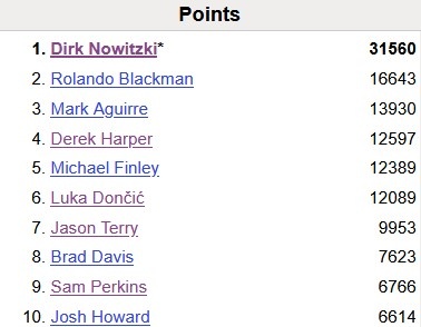 本場過后,諾維茨基隊(duì)史得分來到16644分,超越羅蘭多-布萊克曼(16643分),成為球隊(duì)的得分王。而諾維茨基在小牛的最終職業(yè)生涯得分定格在31560分。