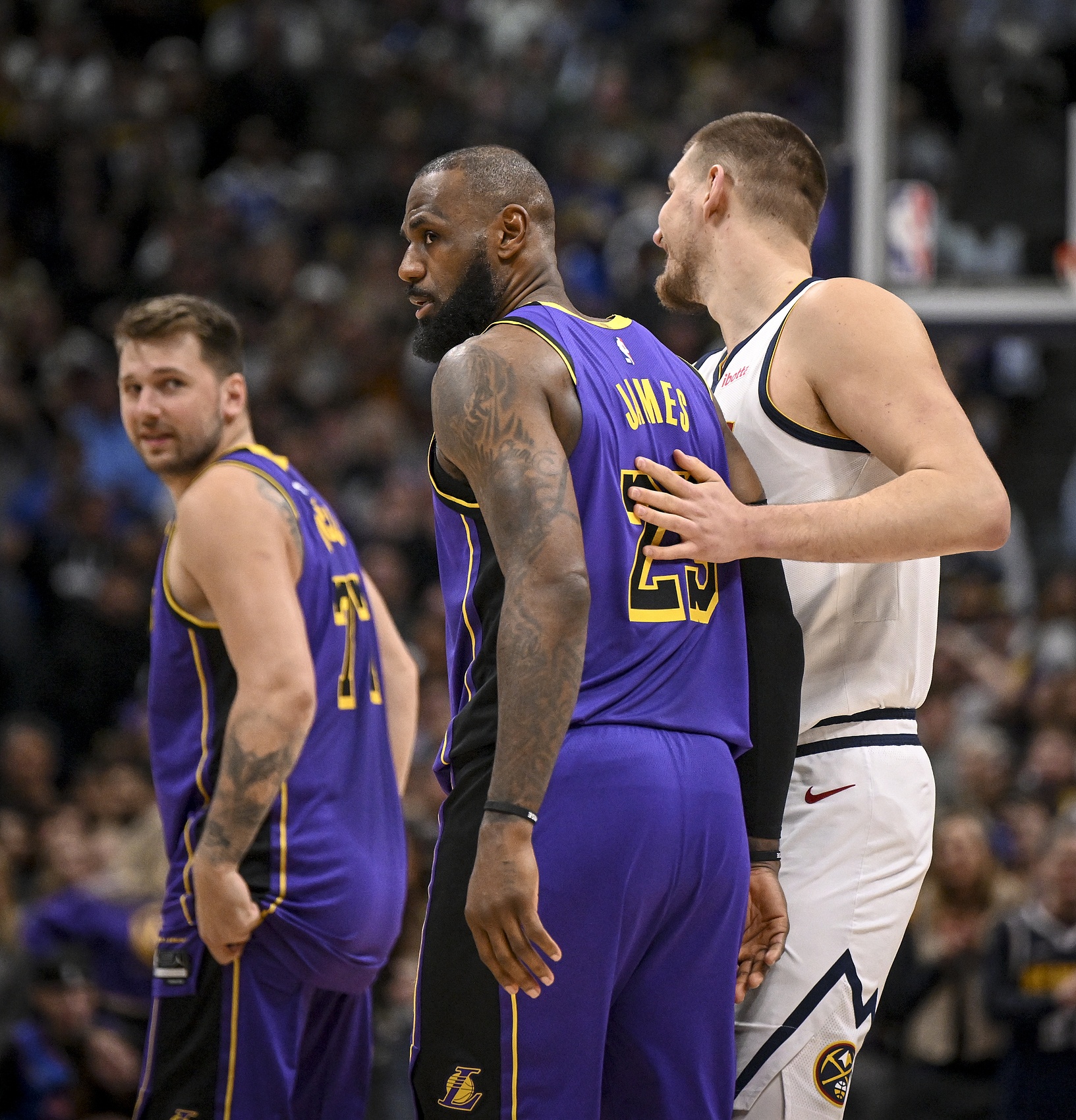 詹姆斯離場時明顯一瘸一拐的,但他并未表現(xiàn)出沮喪。詹姆斯不必再獨自用寬闊的肩膀扛起球隊——離開更衣室時,他拍了拍東契奇的后背。