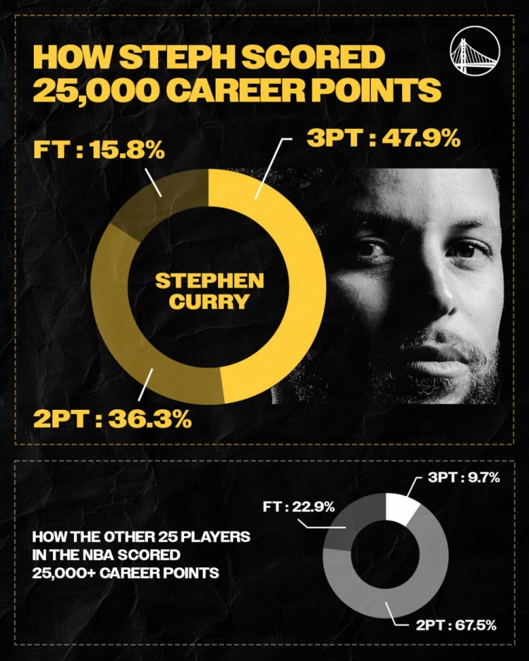 庫(kù)里25000分得分方式占比:兩分36.3%,三分47.9%,罰球15.8%;聯(lián)盟歷史上其他25位得分超25000的球員:兩分67.5%,三分9.7%,罰球22.9%。 標(biāo)簽: 籃球 NBA 勇士 庫(kù)里