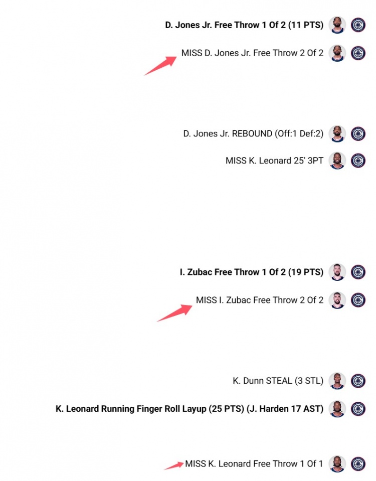 在比賽的最后2分33秒至1分15秒的決勝時刻,瓊斯、祖巴茨分別兩罰一中,小卡罰丟加罰,一共3次罰球打鐵。