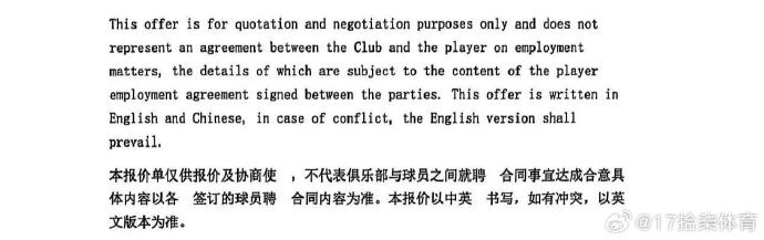 二 多家俱樂部對哈雷爾感興趣并進(jìn)行了談判,其間另一家中方經(jīng)紀(jì)公司在浙江稠州銀行俱樂部與哈雷爾的談判過程中簽訂了一份報價單,其中明確約定“該報價單僅供報價和協(xié)商使用,不代表球員與俱樂部完成聘用合同簽約。”——這也是浙江稠州銀行俱樂部多次公告中含糊其辭提及的“簽約”。最后,在多家俱樂部中談判協(xié)商中球員哈雷爾于二月十日選擇了簽約新疆廣匯俱樂部,三方按中國籃協(xié)和CBA公司要求簽訂了標(biāo)準(zhǔn)合同并在中國籃協(xié)完成了經(jīng)紀(jì)人備案。