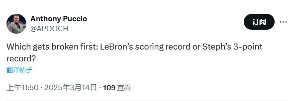 對(duì)此,記者Anthony Puccio發(fā)推問道:“詹姆斯的得分紀(jì)錄和庫里的三分紀(jì)錄,哪個(gè)會(huì)先被打破?”