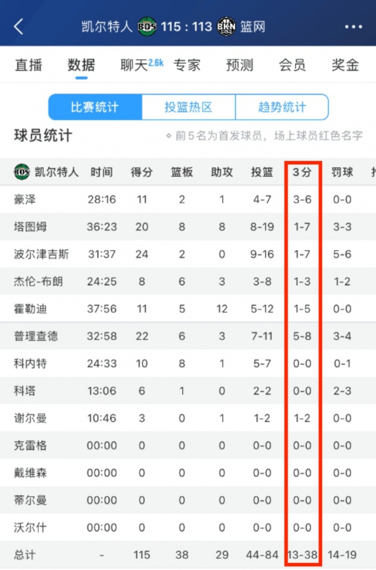 本場比賽,凱爾特人全隊(duì)三分整體來說有些失準(zhǔn),38投13中,命中率僅34.2%;除了普理查德(8中5)和豪澤(6中3)正常發(fā)揮外,其余人皆失常,僅24中5。