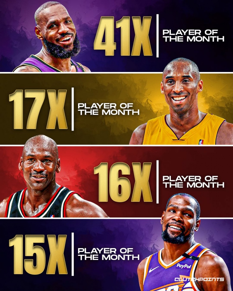 詹姆斯41次月最佳歷史斷檔第一 科比17次第二 喬丹16第三KD15第四
