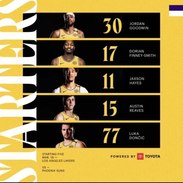 3月17日訊 今日,湖人官方賽前公布了本場(chǎng)比賽的首發(fā)陣容。