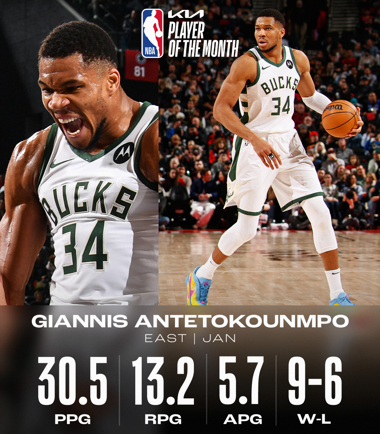 02月05日訊 NBA官方公布了1月東西部最佳球員:東部字母哥、西部約基奇分別當(dāng)選。