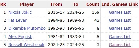 本場(chǎng)是威少加盟掘金以來第4場(chǎng)三雙,這已經(jīng)能排到掘金隊(duì)史三雙榜前5。