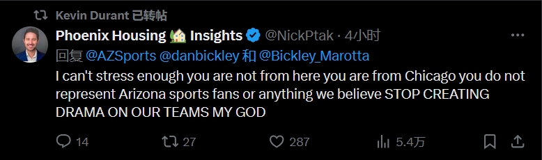 球迷一:我簡(jiǎn)直不能更強(qiáng)調(diào)這一點(diǎn),你不是本地人,你是芝加哥人,不能代表亞利桑那州的體育迷,也不能代表我們的任何想法。停止在我們的球隊(duì)制造鬧劇吧,老天??!