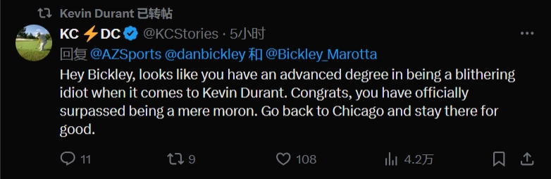 球迷三:嘿,看來你在"如何成為關(guān)于凱文-杜蘭特的胡說八道專家"這方面已經(jīng)獲得了高等學(xué)位。恭喜你,你正式超越了一個(gè)普通的白癡????。趕緊滾回芝加哥,永遠(yuǎn)待在那兒吧。