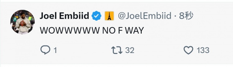 恩比德發(fā)推寫道:“哇哦.... 臥槽不會吧?!?/p>