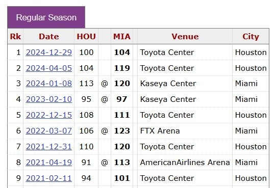 這樣一來,火箭結(jié)束了自己對熱火的常規(guī)賽9連敗,具體如下: