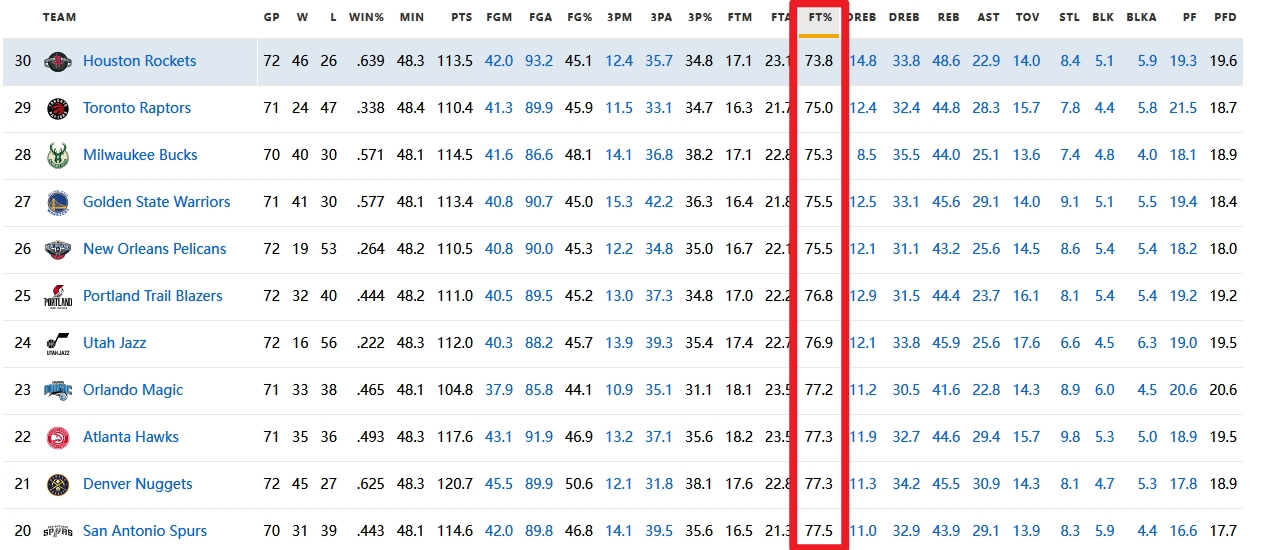 賽季至今,火箭場均23.1次罰球,命中率僅有73.8%,聯(lián)盟倒數(shù)第一。